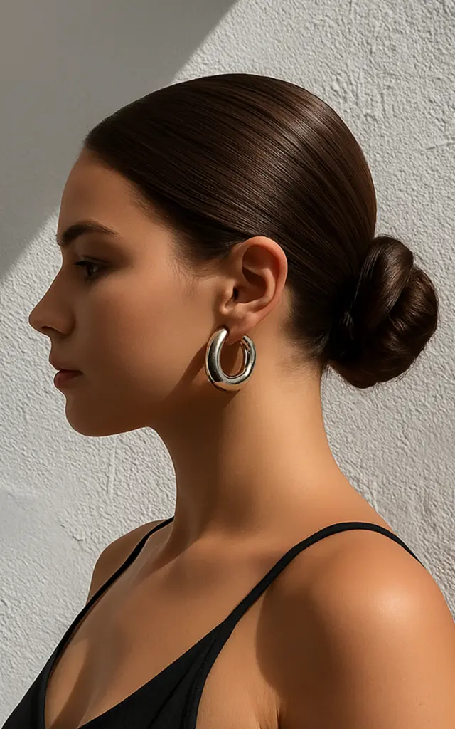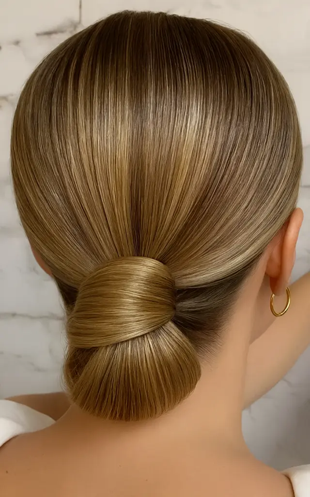 Passo 3 – Embrulhe para criar o coque: Divida o rabo de cavalo em duas seções. Enrole a primeira mecha ao redor da base, formando o anel central do coque, e prenda com grampos. Em seguida, envolva a segunda mecha por cima, alternando a direção para criar o efeito “embrulhado” (wrap-around) que adiciona profundidade e textura ao penteado. É essa sobreposição precisa que confere o acabamento luxuoso e elegante.