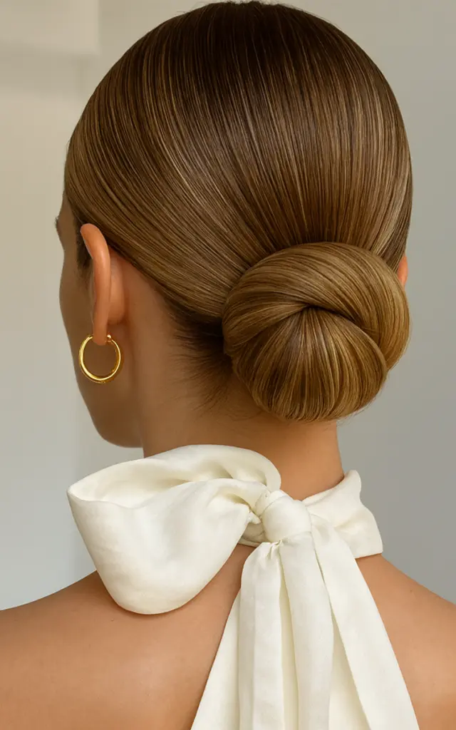 O coque baixo e polido é um clássico absoluto das festas mas, que nas mãos dos experts do salão Stephen Knoll New York, ele ganha uma sofisticação extra graças à técnica conhecida como Wrap-Around Bun. Esse método cria um acabamento impecável, com brilho cremoso e estrutura elegante, ideal para jantares, confraternizações e qualquer evento mais formal, onde você queira transmitir a ideia de luxo silencioso e sem esforço.