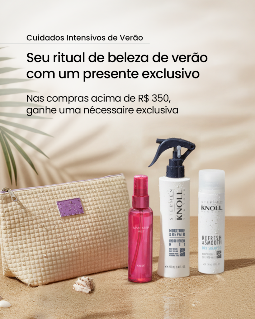 Nas compras acima de R$350, você ganha uma necessaire exclusiva personalizada de Stephen Knoll New York para levar seus essenciais de beleza para onde quiser.