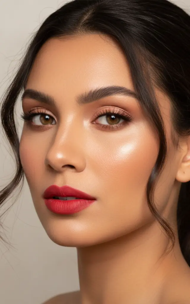 Opção 2: Lábios Destacados: Se quiser mais impacto, escolha um batom vermelho cereja, vinho rosado ou terracota profundo. Os tons intensos equilibram o smokey e deixam o look ainda mais sofisticado.