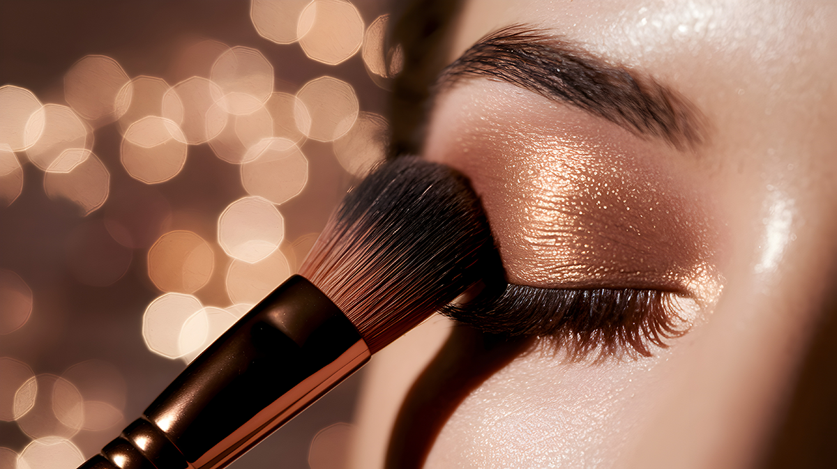 Passo 3 – Um Toque de brilho nos olhos (1 minuto): Deposite uma sombra cintilante dourada ou rosé com o dedo.